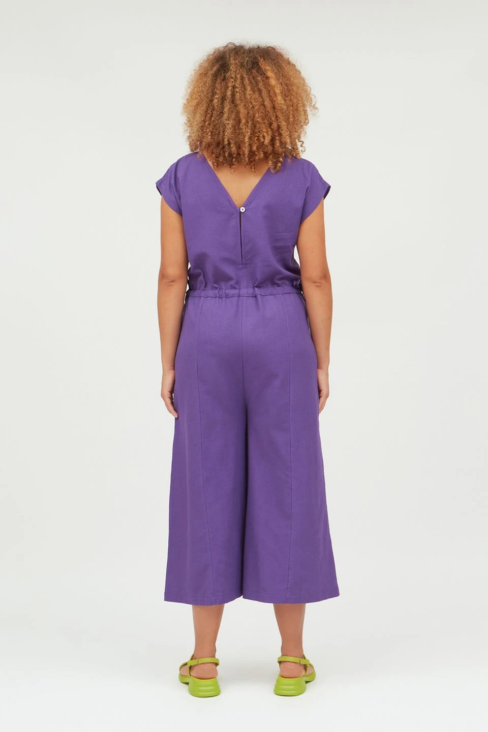 Ein Traum in Lila. Der Jumpsuit Num besteht aus einem Material aus 85% Baumwolle und 15% Leinen. Leinen ist besonders strapazierfähig, hat eine hohe Hautverträglichkeit und eine super Feuchtigkeitsregulierung. Er lässt sich in Taillenhöhe durch einen Tunnelzug enger stellen. Hinten und vorne hat er einen V-Ausschnitt, wobei hinten ein kleiner Knopf zum Reinschlüpfen angebracht ist.